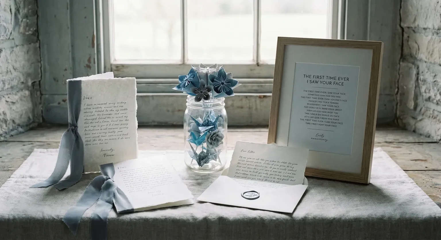 Not an email. Not a text. Real ink. Real specifics. A traditional first gift, done right. For structure and prompts, see how to write a first-anniversary love letter worth keeping. This kind of letter slows time down—vulnerability that does not live in a drafts folder. A first wedding anniversary can carry that kind of honesty.